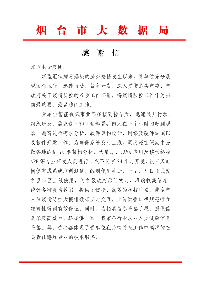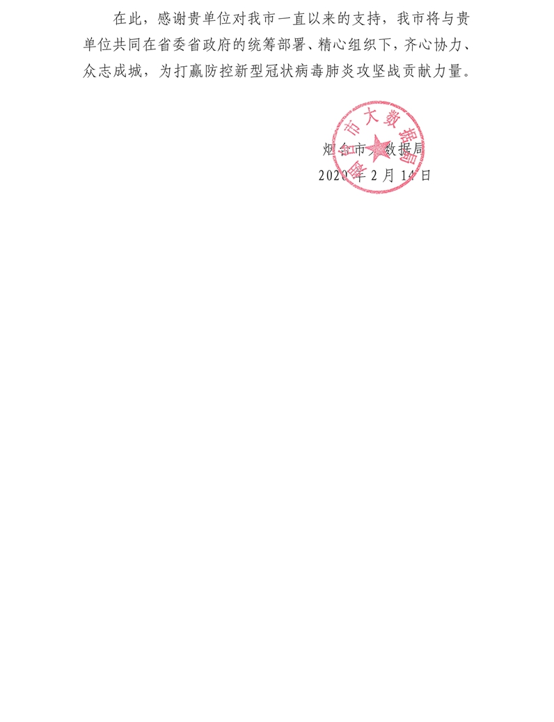 煙臺(tái)市大數(shù)據(jù)局給公司的感謝信