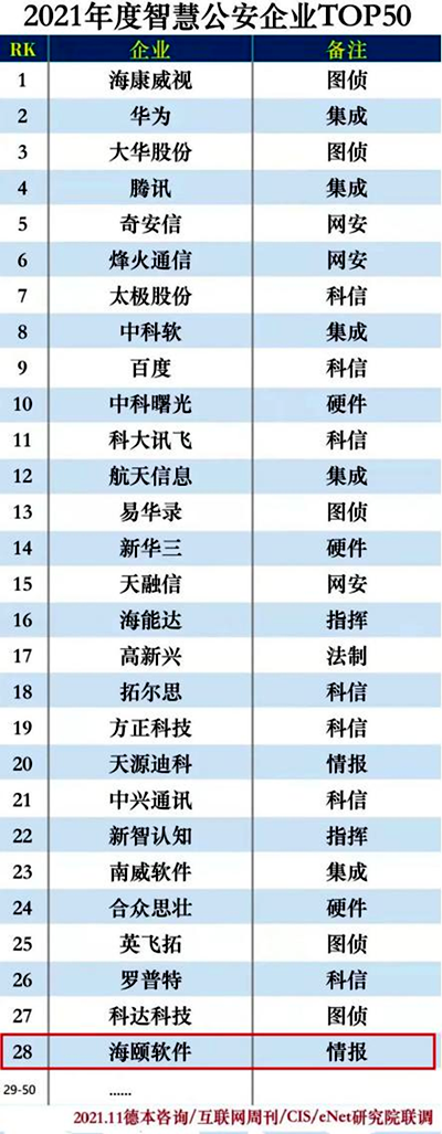 11月24日,互聯網周刊發布2021年度智慧公安企業TOP50,煙臺海頤軟件公司上榜。